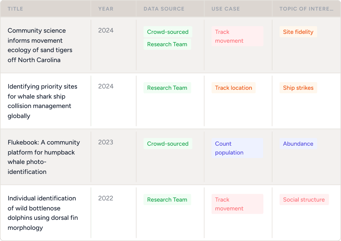 Without time for extensive user interviews, I analyzed 37 academic papers published by WildMe users, looking for their research questions, data collection methods, workflows, and pain points.